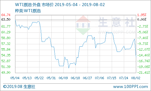 8月1日,受中美貿(mào)易戰(zhàn)談判再度陷入僵局以及美聯(lián)儲降息提振美元走強影響,美國WTI原油期貨市場價格暴跌,報53.95美元/桶,跌幅為4.63美元,布倫特原油期貨價格暴跌,報60.50美元/桶,跌幅為4.55美元。美國原油期貨重挫7%,創(chuàng)6周以來的最低收盤價。布倫特原油期貨價格下跌超過6%,創(chuàng)七周以來最低收盤價,同時創(chuàng)2016年2月以來的最大單日跌幅。